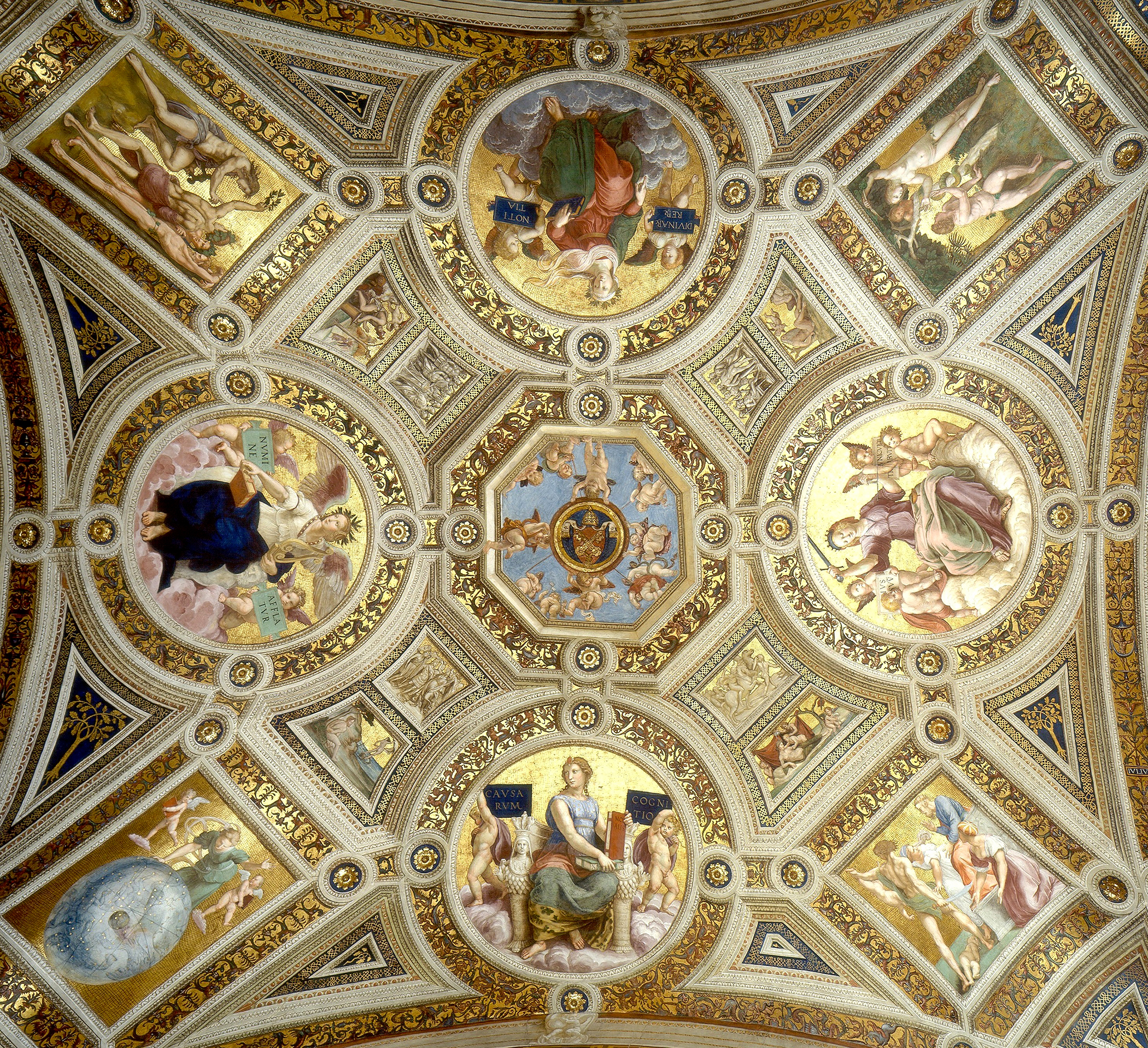 Há muitos anos comprei numa loja que enquadrava pinturas as “Quatro Tondi”, gravuras, cópias das autênticas e belíssimas criadas por Raffaello Sanzio que se encontram no teto da Stanza della Segnatura na Capela Sistina, em Roma.